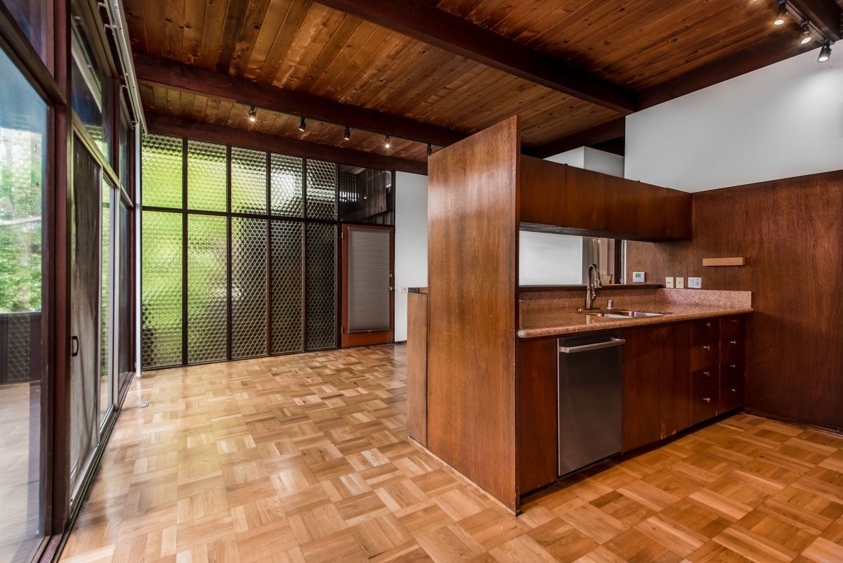 Tranquil escape in the heart of Brentwood! Rustic mid-century architectural condo nestled in a small complex on a quiet cul-de-sac. High wood-beam ceilings and towering walls of bottle-bottom glass add volume and a woodsy retro vibe to the living room and open kitchen, which features stainless steel appliances. Two bedrooms, an updated bath, and decks off the living room and bedrooms complete the property. Moments away from prime Brentwood shopping and dining on San Vicente Boulevard. Parking for 1 vehicle. Available for immediate occupancy.