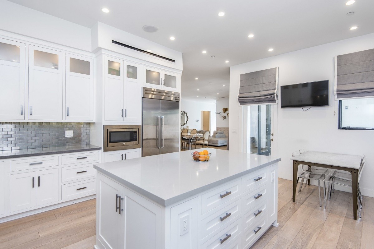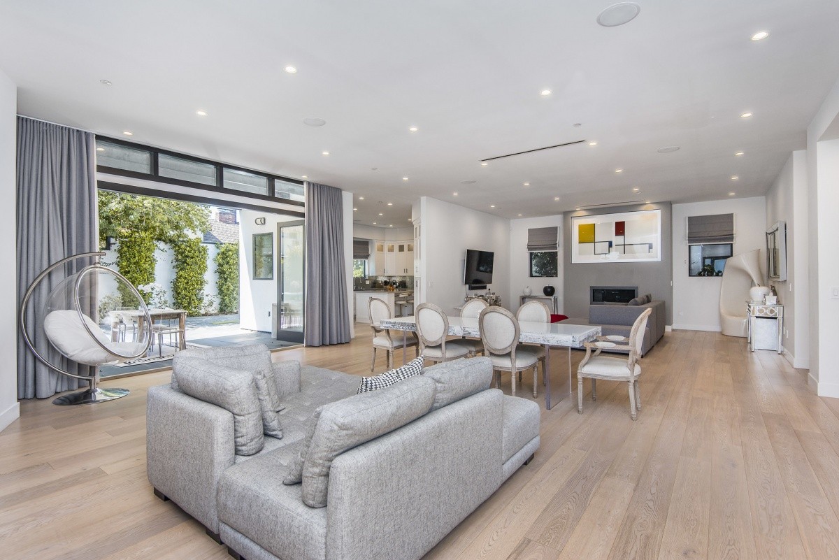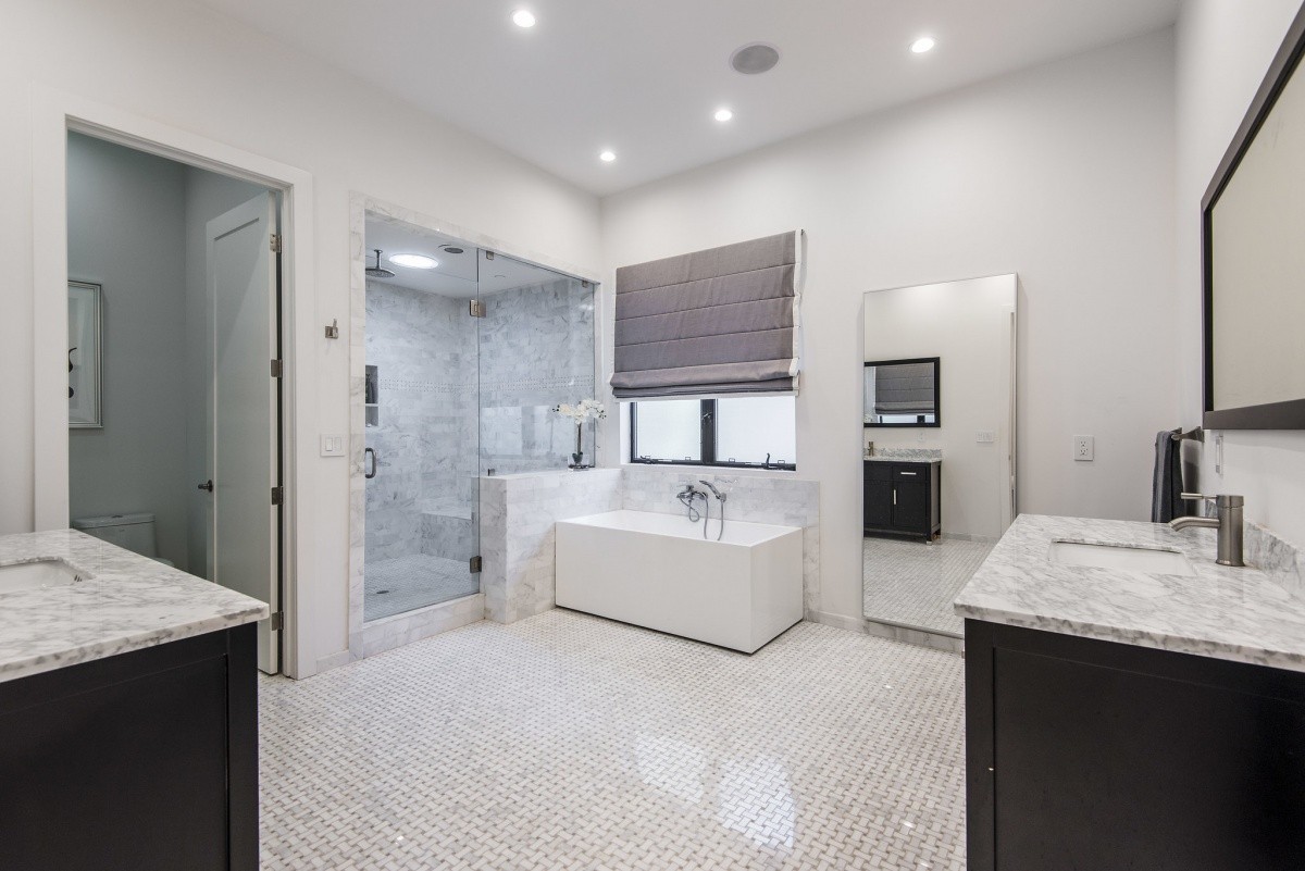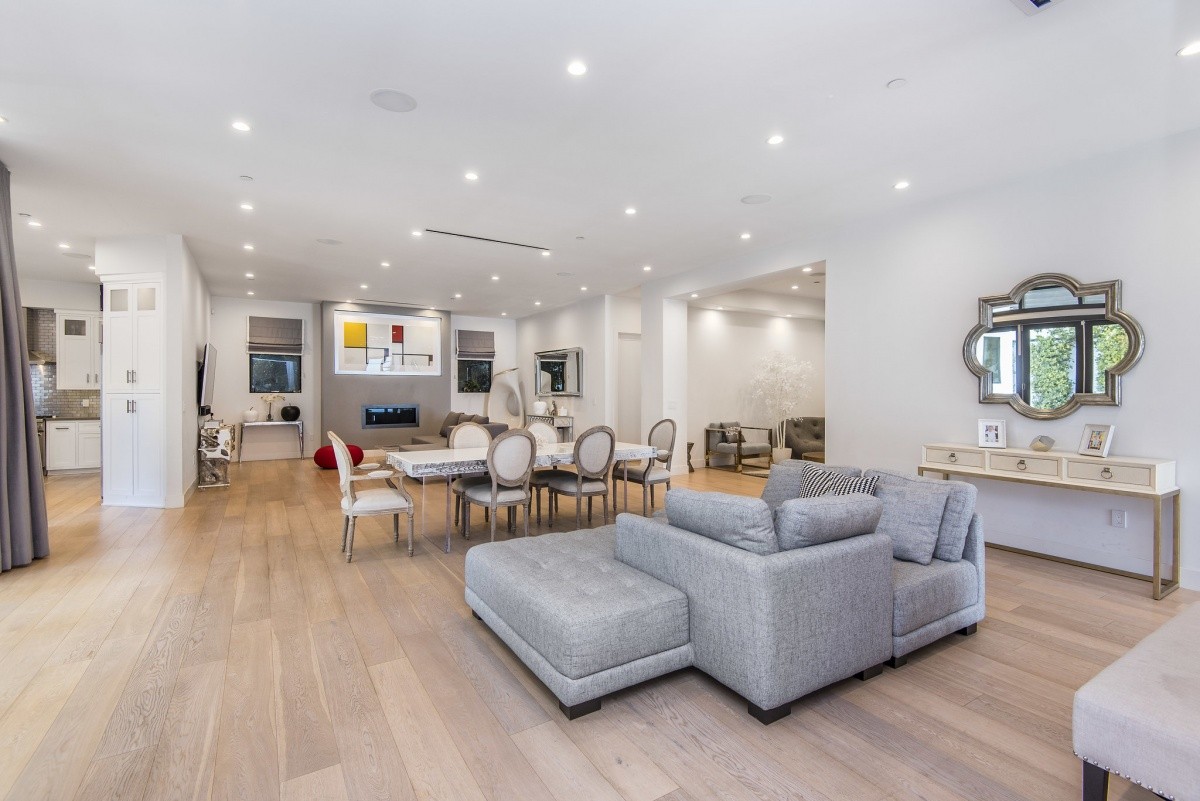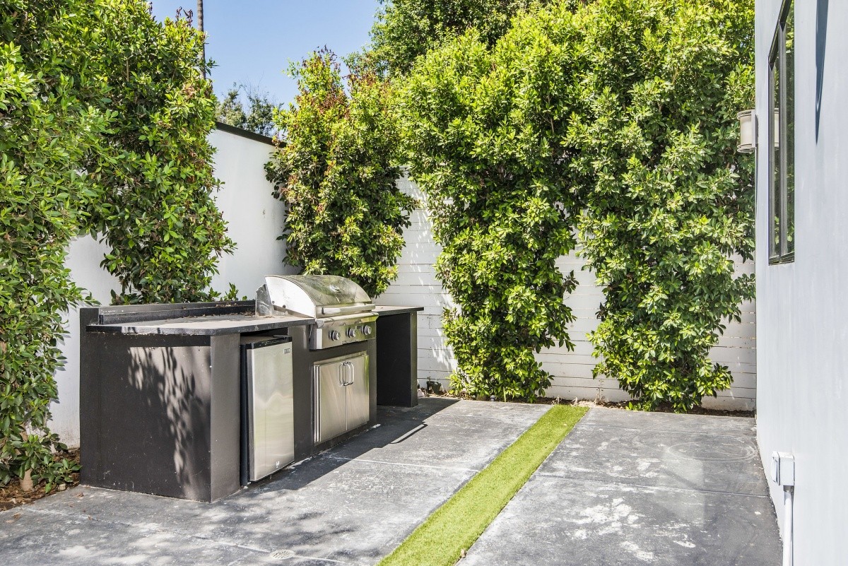Gated ultra-modern showplace, newly completed in 2015 and located in the coveted Hesby Oaks K-8 school area. Soaring ceilings and dramatic volume abound throughout the one-level luxury residence, which features crisp white walls, recessed lights, and wide-plank wood floors. A massive open concept entertaining space offers endless possibilities for dining, living, and family room layouts, and opens out to the spacious lounge patio with built-in barbecue. The gourmet kitchen boasts Thermador appliances, quartz counters, a large center island, and breakfast area. Private and serene, the master suite includes two fully customized walk-in closets, and a spa-like bathroom with dual vanities, soaking tub and oversized shower. Other amenities include a laundry room, dual zoned HVAC, tankless water heater, security system, wiring for sound and closed circuit TV, skylights, low-maintenance grounds, and a two-car garage. Located moments away from world-class shopping, dining, and entertainment.