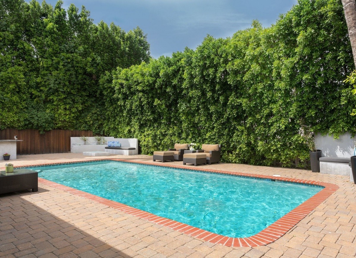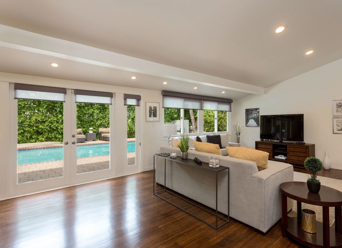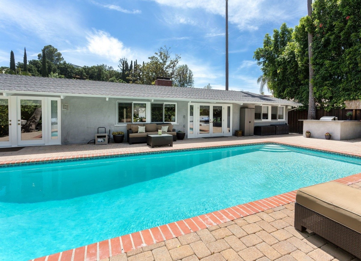Stunning single-story residence with a shimmering pool, located South of Ventura Boulevard in the heart of Encino. Gated and hedged for privacy, the voluminous open floor plan throughout the 3 bedrooms and 2 bathrooms represents the perfect merging of traditional and modern styles. Well-crafted interior finishes and custom designed skylights that provide a soft natural light throughout. The gourmet chef’s kitchen includes newer double ovens, a Viking range, new under counter wine refrigerator, Bosch dishwasher, and soft-closing drawers. Other features include newly stained bamboo floors, new custom window shades, private access side doors into the spacious master bedroom suite, dual pane windows, recessed lighting, and a new garage door and keypad. Two sets of French doors open out from the living space to the beautiful backyard pool and patio, complete with built-in BBQ entertainment center and fire pit with surrounding bench seating. Truly the epitome of Southern California living, located seconds away from wonderful shops, fine dining, top-rated Lanai Elementary School, parks, and entertainment!