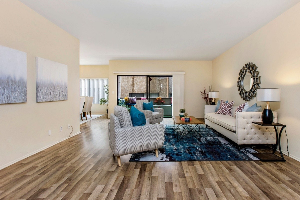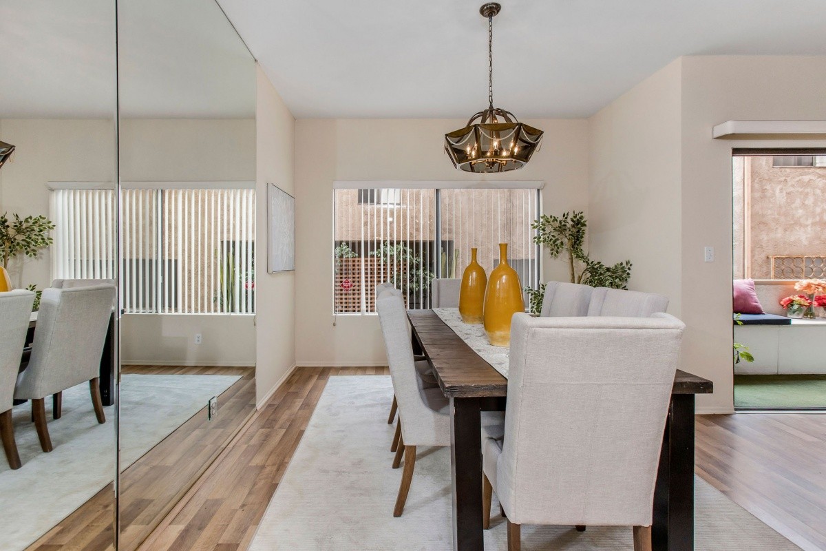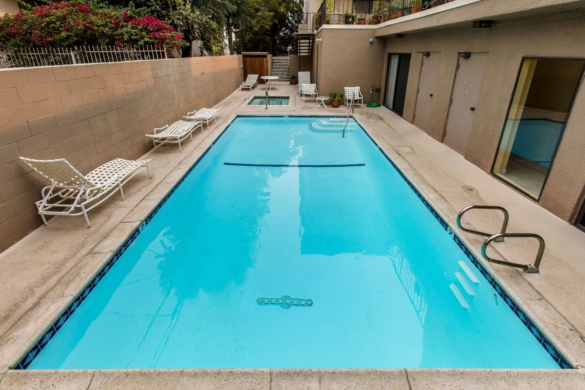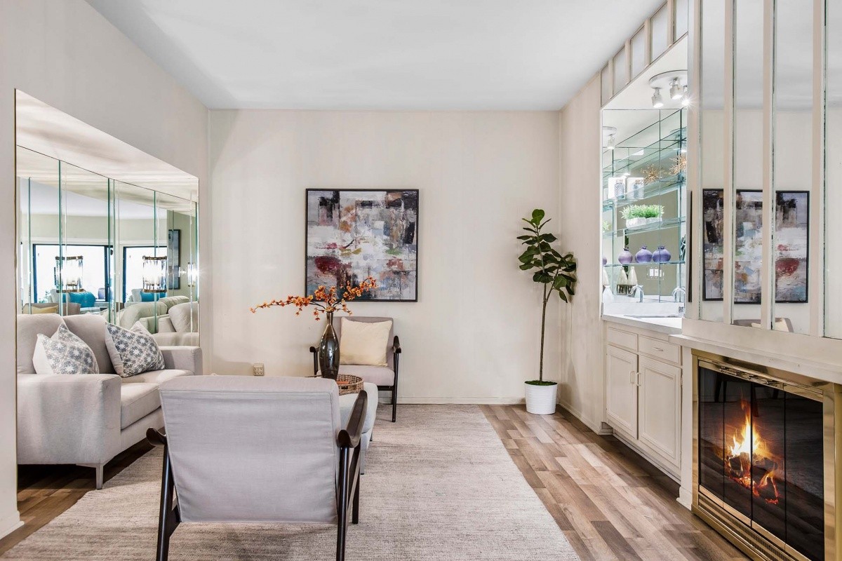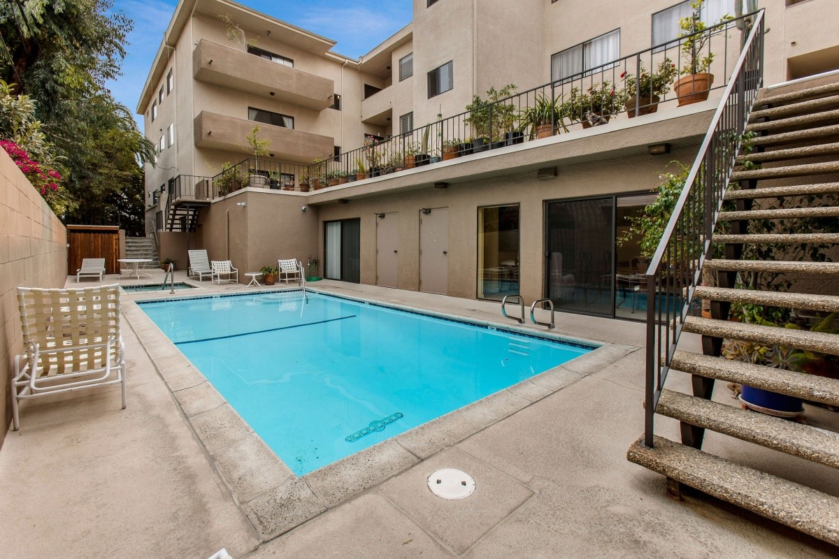 Wonderful opportunity to customize this spacious 1 bedroom + den Westwood condo with 1.5 baths and nearly 1400 sq. ft of interior living area. Located on a quiet street minutes away from UCLA and Century City, this excellent building boasts a pool and spa, fitness room, and low HOA dues. The open floor plan features a large living room with adjacent dining area at one end and adjoining den at the other that could function as a separate office or space for guests. The living room has sliding door access to a private balcony with built-in bench storage and room for patio garden and sitting area. The large kitchen has plenty of counter space, an informal dining nook, and a bona fide laundry room. The private and quiet bedroom offers an en suite bath with double vanity and separate tub/shower. A massive walk-in closet and roomy linen closets in the hallway provide ample storage. Additional upgrades and amenities include a fireplace, wet bar, wood-look flooring, new carpet in the bedroom, and fresh paint. Two parking spots and extra storage in a secure, gated garage. Add value by upgrading to your own taste, and enjoy comfortable living close to Westside attractions and businesses.