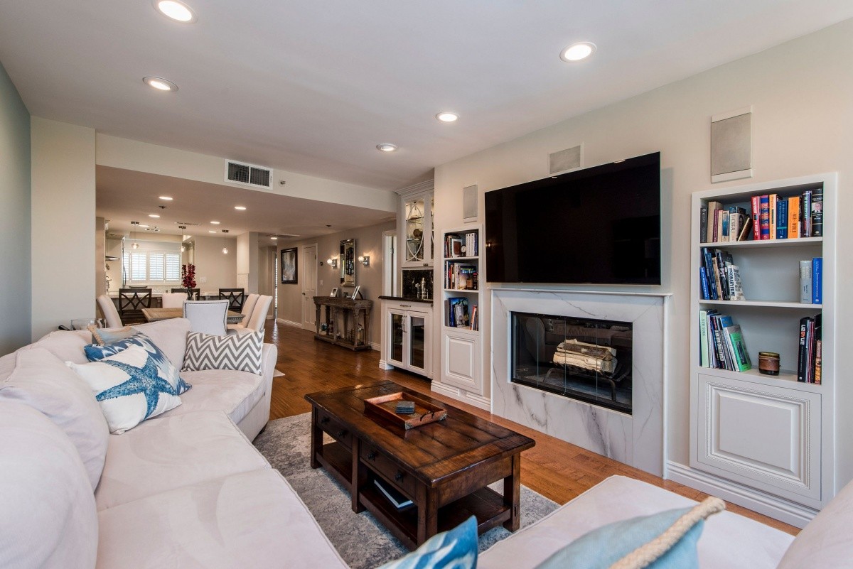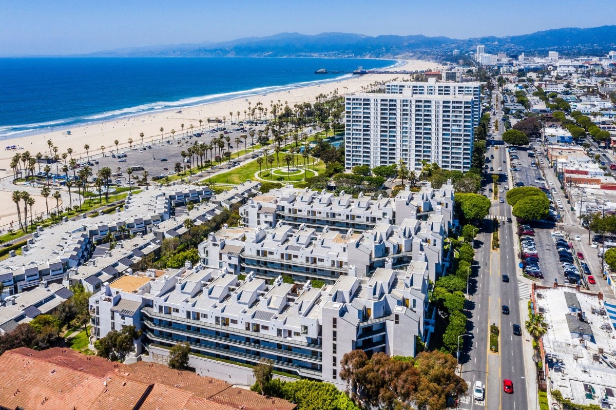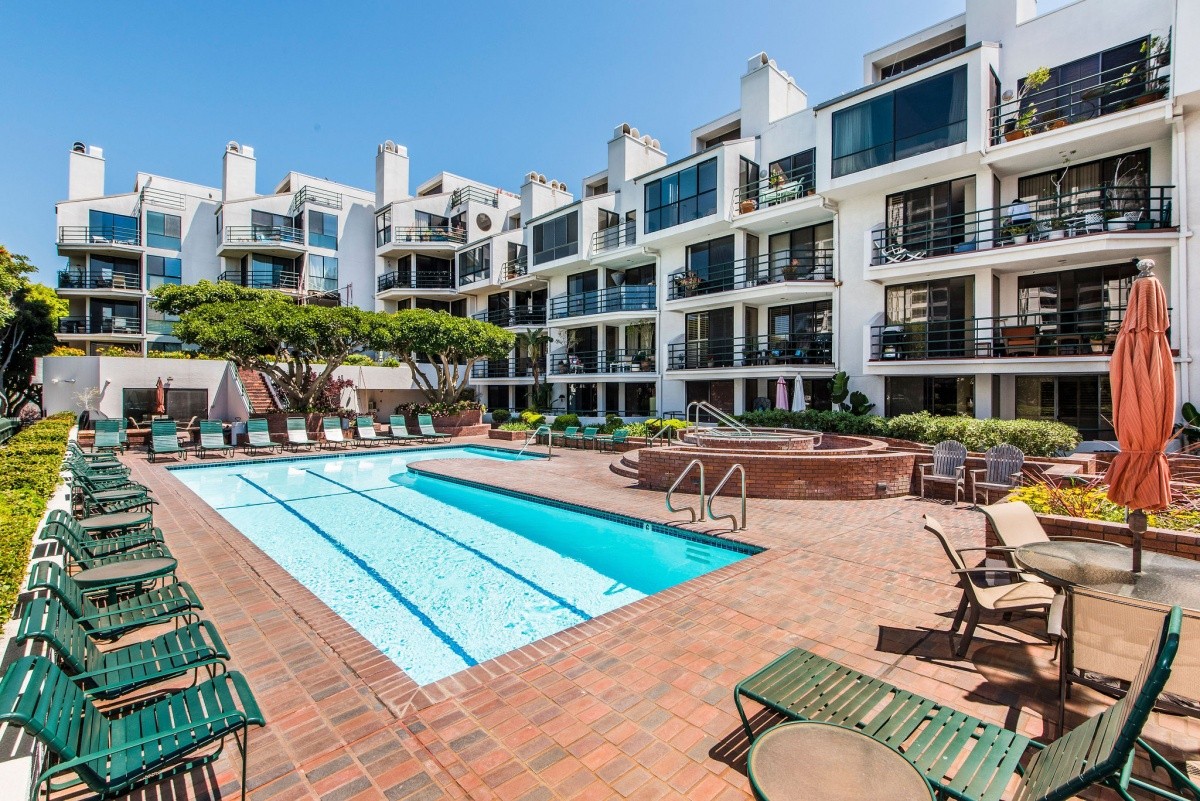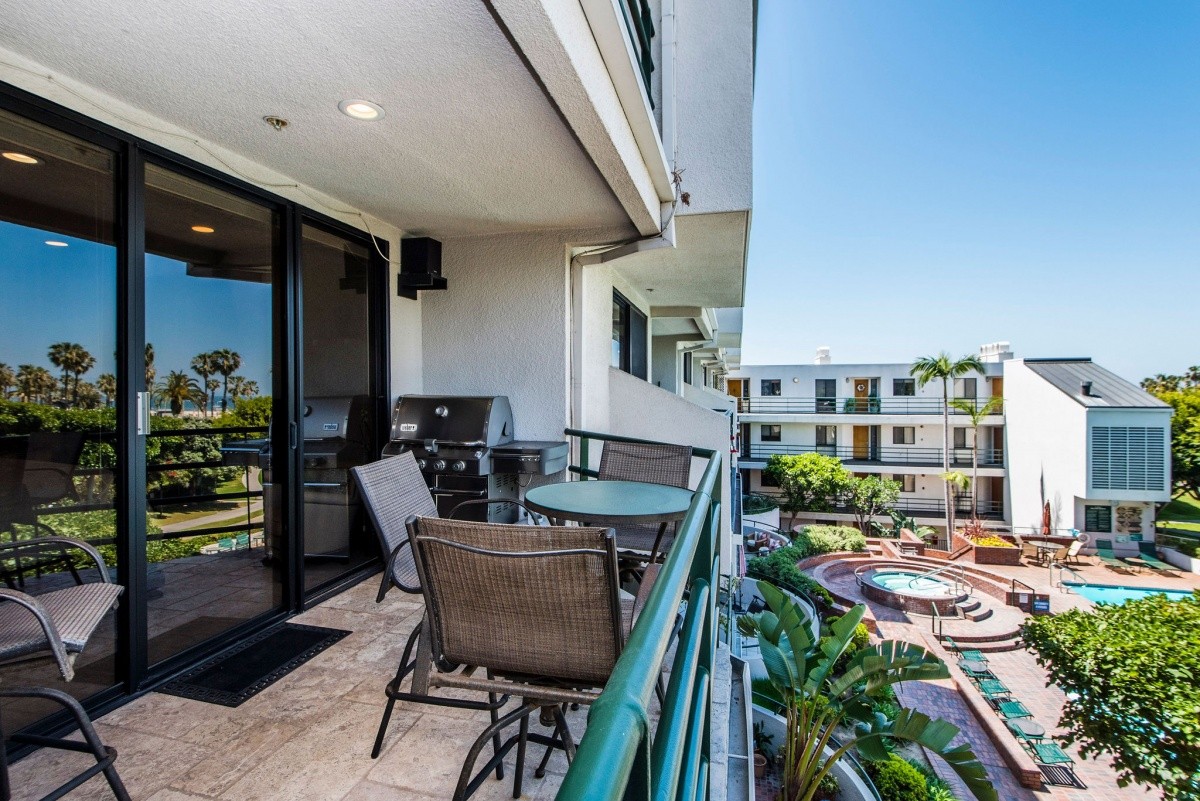 Beachfront living at its finest in this stunningly updated 4th floor residence with views of the pool, palms, and ocean beyond. Beautifully designed for upscale entertaining and everyday living, the spacious living room features built-in shelves and cabinets, a marble adorned fireplace, built-in speakers, a fabulous bar area with bottle storage, and access out to the private balcony for al fresco dining and enjoying picture perfect sunsets. The open dining area flows effortlessly into the gourmet kitchen, which boasts casual bar dining, marble countertops, stainless steel appliances, a wine cooler, and a functional work space. The sumptuous master bedroom includes a walk-in closet, and a spa-like bath with dual sinks and separate tub/ shower. A second bedroom, guest bath, and in-unit laundry complete the living space. Also included are two SxS parking spaces, plus an additional storage locker. Prestigious Sea Colony II is a 24-hour guard gated community offering world class resort amenities: heated pool, 3 spas, gym, rec room, onsite manager, and a private walk to the sand. All located seconds away from Main St. shops and restaurants, Abbott Kinney, tennis and basketball courts, luxury malls, the Metro, and more!