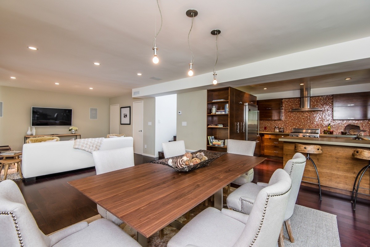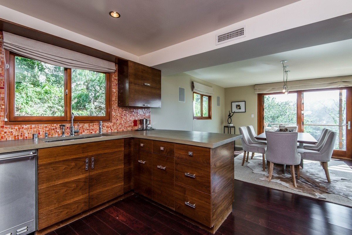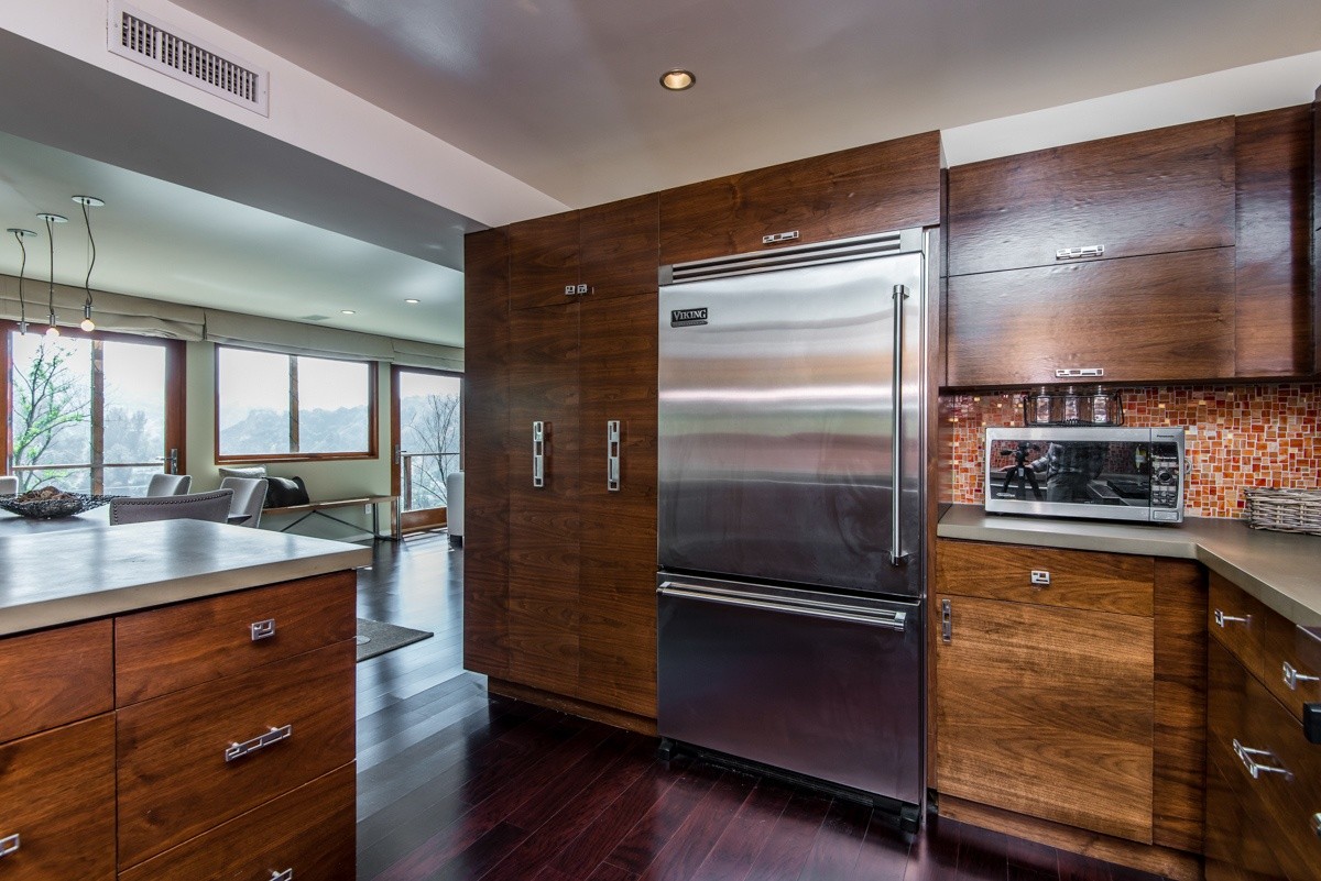 The pinnacle of modern hills living, this sublime escape seamlessly blends 1960's post and beam architectural elements with modern upgrades such as video security, integrated surround sound speakers, and remote-operated shades. Stunning wood-framed windows and sliding doors offer abundant natural light and showcase sweeping views of the canyon and surrounding hills views from nearly every room. The open-concept entertaining level boasts a fabulous gourmet kitchen with Viking Pro appliances, and living and dining areas that open out to a sprawling deck for outdoor enjoyment. Two oversized bedrooms reside upstairs; the master suite includes numerous built-ins, a free-standing fireplace, and a sumptuous bath with skylight. Walled and gated for utmost privacy and security. Fabulous Studio City hills location – moments away from Ventura Boulevard, and easy access to freeways or the Westside.