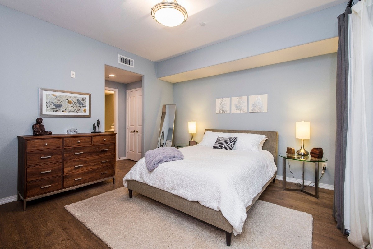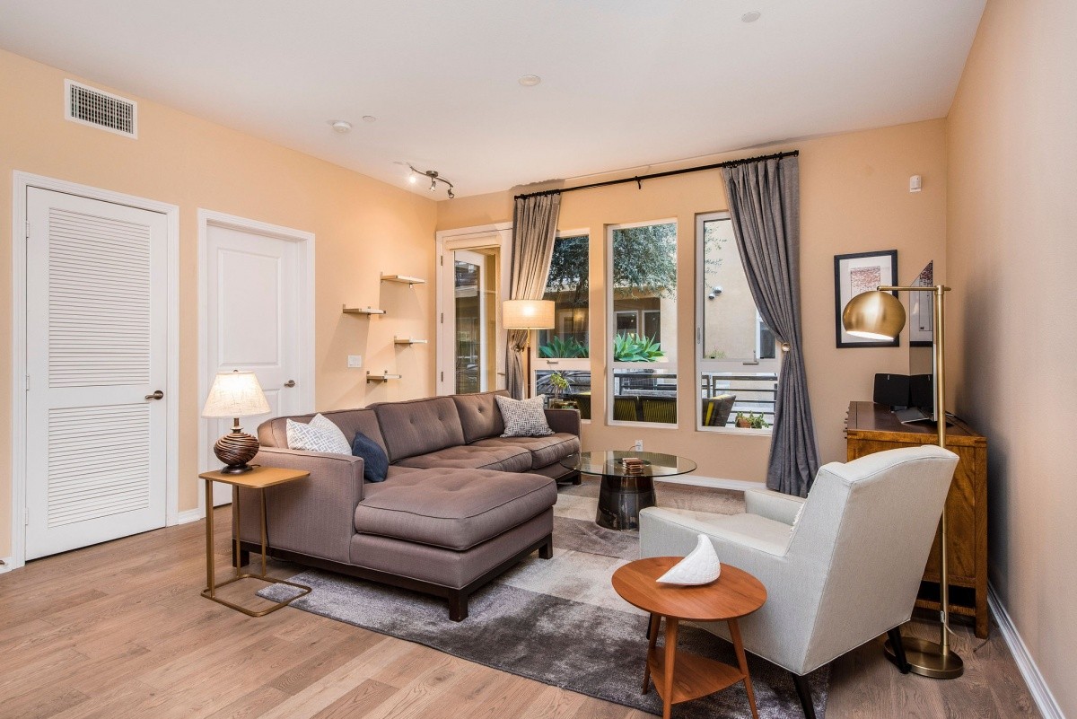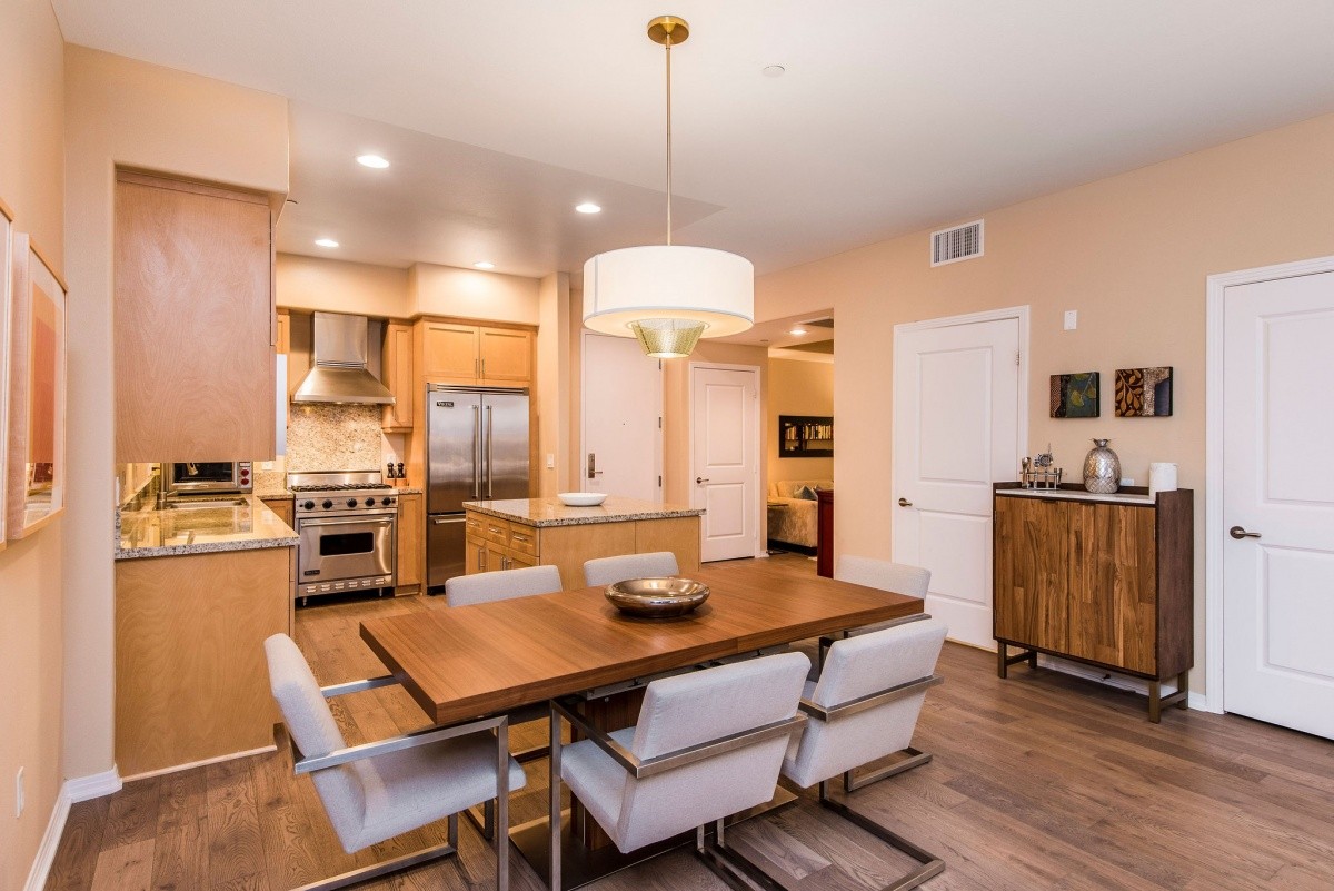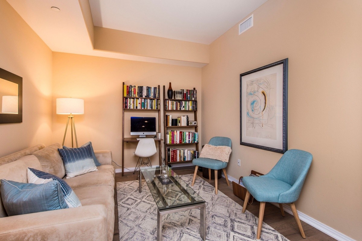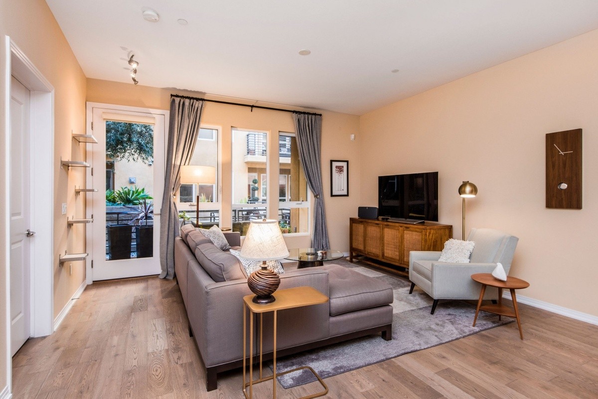 Stunningly appointed 1-bdrm + Den residence in the heart of Marina Del Rey! Sophisticated yet inviting, the gorgeous interior space features soaring ceilings throughout and a sprawling open layout in all entertaining rooms. The gourmet kitchen with Viking appliances and a large center island opens effortlessly into the dining area, which flows into the living room featuring walls of windows and a door out to the private patio. Quiet and private, the master suite boasts his and hers closets, and a spa-like bath with dual vanity and separate tub and shower. The den provides amazing versatility for use as a media room, home office, or even a second bedroom. Other features include in-unit laundry, beautiful custom flooring, and two side by side parking spaces. The highly regarded Indigo complex includes EQ insurance, and features two courtyards, community BBQ grills, a large gas fire pit and sitting area, indoor spa with sauna and hot tub, and well-equipped gym. Moments away from thriving shops, restaurants, movie theaters, parks and beaches!