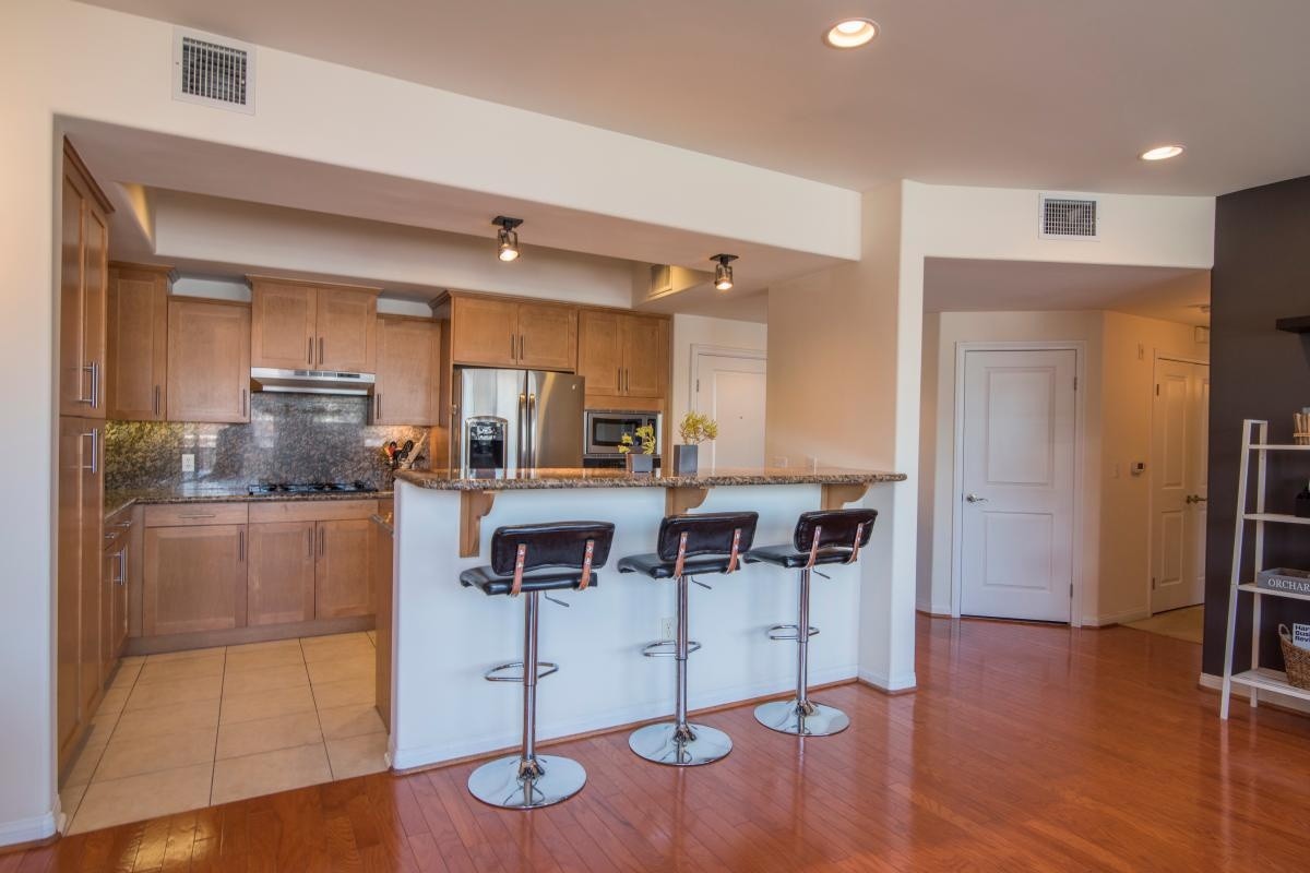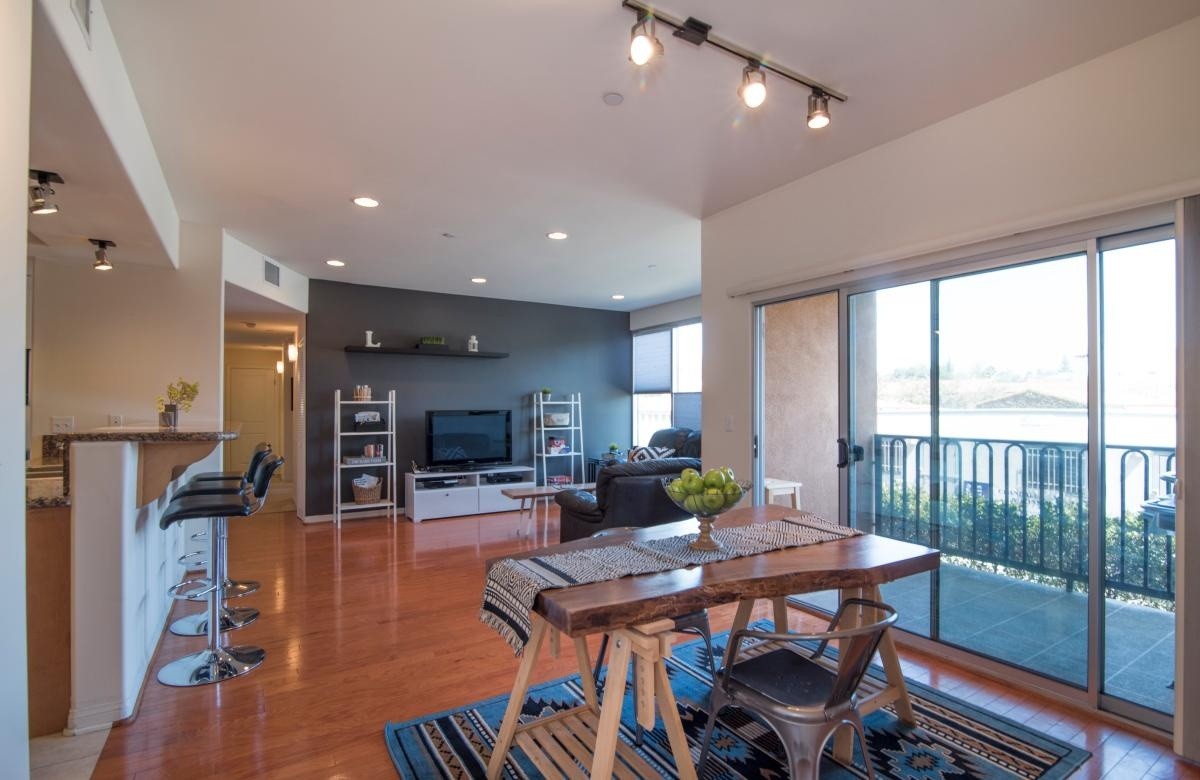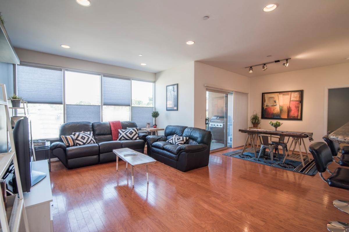 This hip modern 3-bedroom condo exemplifies NoHo living at its best. Natural light floods in through floor to ceiling windows in the living room, illuminating the glossy hardwood floors and soaring ceilings throughout the entertaining space. The open gourmet kitchen includes custom cabinets, gleaming granite countertops, stainless steel appliances, and a casual dining bar. A spacious dining area opens out to the private balcony. The sprawling master suite features a walk-in closet, and sumptuous bath with a large soaking tub and separate shower. Two additional bedrooms reside on the opposite side of the unit, enhancing the privacy for residents or guests. A large storage room and extra deep hall closets provide tons of functional storage options. Built in 2006, the Bedford Arbors complex features a secure front entrance, gated parking garage, a gym/ fitness center, and a large open air community patio that features a barbecue, bar area, fire pits, and pool table. Located close to Tujunga Village, Toluca Lake, and the hottest dining and entertainment spots in the NoHo Arts district,