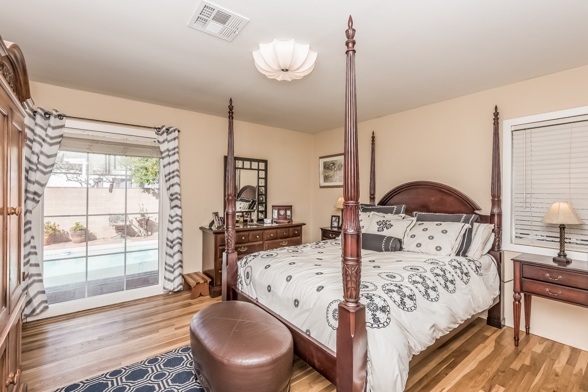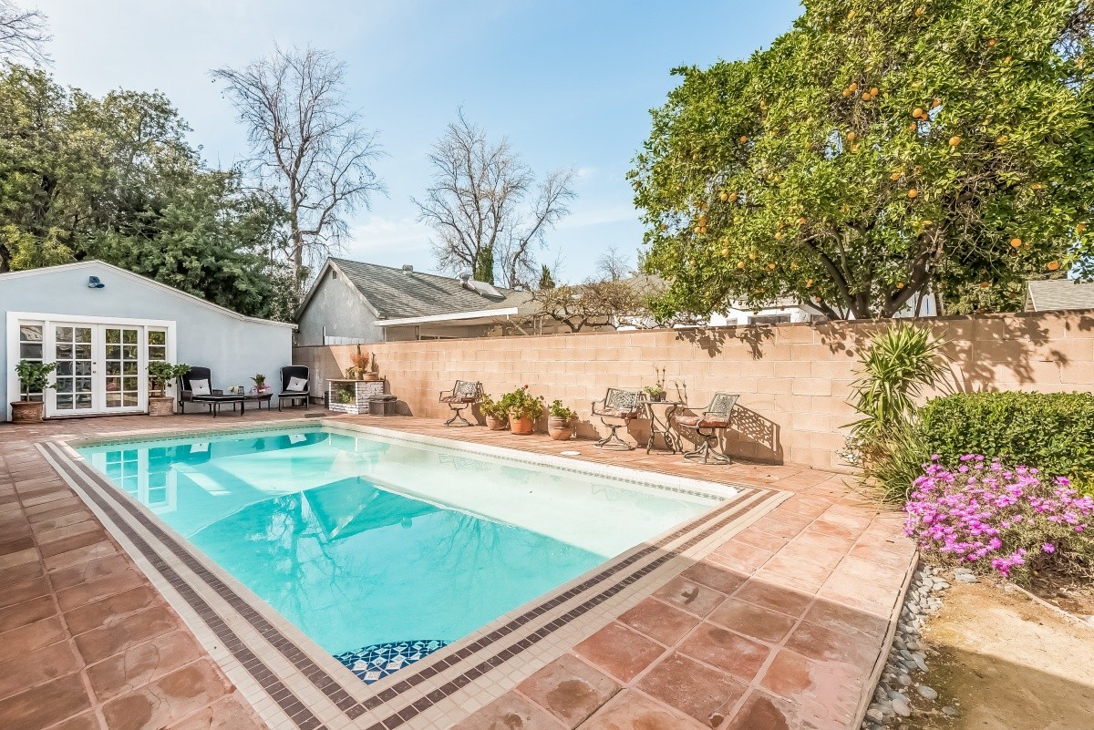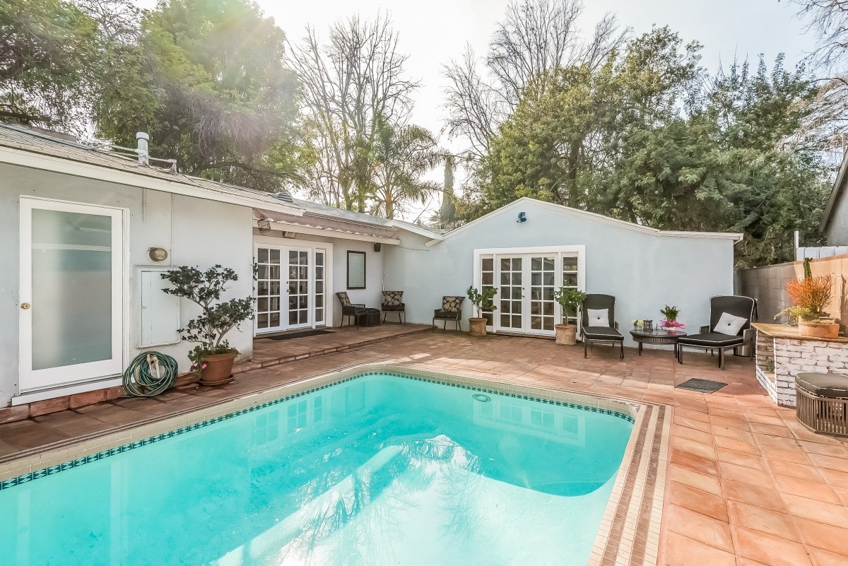Quiet and spacious retreat with a pool and separate guest house, located on a beautiful tree-lined block of Woodman Avenue just south of Chandler Estates. The 3 bedroom + den, 2 bath main residence boasts over 2,200 square feet of living space, and offers a wonderful open flow throughout the living room, dining area and sprawling updated kitchen. Features include recessed lights, stainless steel appliances, granite countertops, and glossy hardwood floors in the den and bedrooms. The living room, den, and master bedroom with en suite bath all open out to the sparkling pool and patio area. The den has a huge closet, and could be used as a 4th bedroom. A separate guest unit with bath and wet bar resides at the rear of the property – perfect for live-in family, visiting guests, or use as a gym, office, or home studio. Walled and gated in front and back. Located within minutes of Fashion Square Mall, great restaurants, markets, freeway access, good schools, and more.
