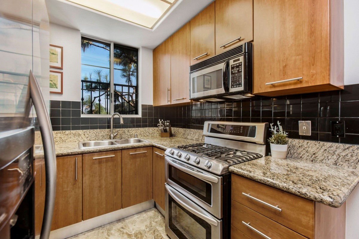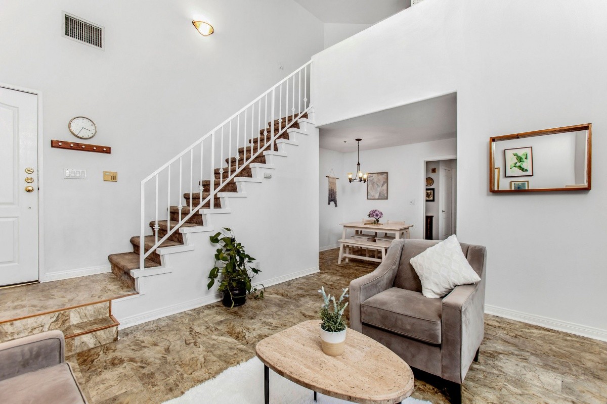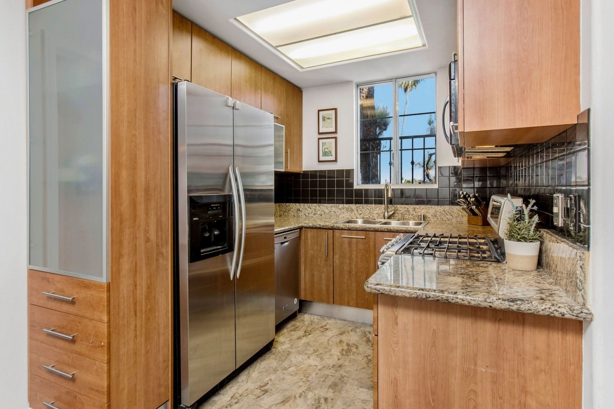 Soaring ceilings and massive volume abound in this light and bright top-floor unit, complete with two spacious bedrooms, an incredible den/ family room that could easily be a 3rd bedroom, functional office space, lots of storage, and in-unit laundry. Great entertaining starts in the gourmet kitchen, which boasts stainless steel appliances and granite countertops, and opens into the dining room and living room with towering windows, a fireplace, and a private balcony. Upstairs, the sprawling den is wired with surround sound, and leads into the large bonus room currently in use as a home office. The secluded master suite includes vaulted ceilings, a cozy fireplace, en suite bath, and three closets. 7037 La Tijera is an appealing Mediterranean-inspired building that was redone in 2003, and also features a gym and a gated parking garage. Centrally located, just moments away from beaches, LAX, freeway access, the Howard Hughes complex, SoFi stadium, the recently redone Forum, and tons of shopping and dining options.
