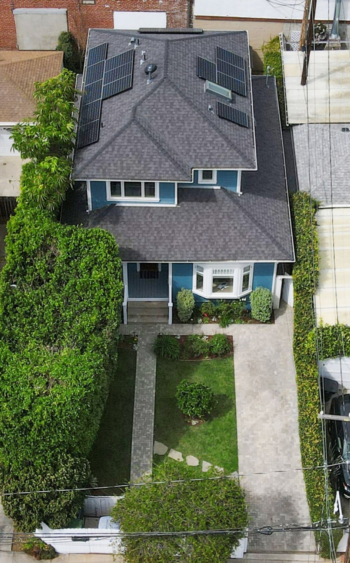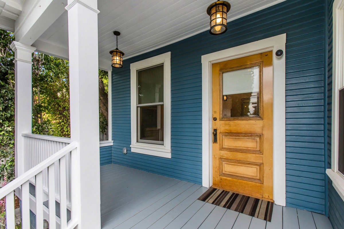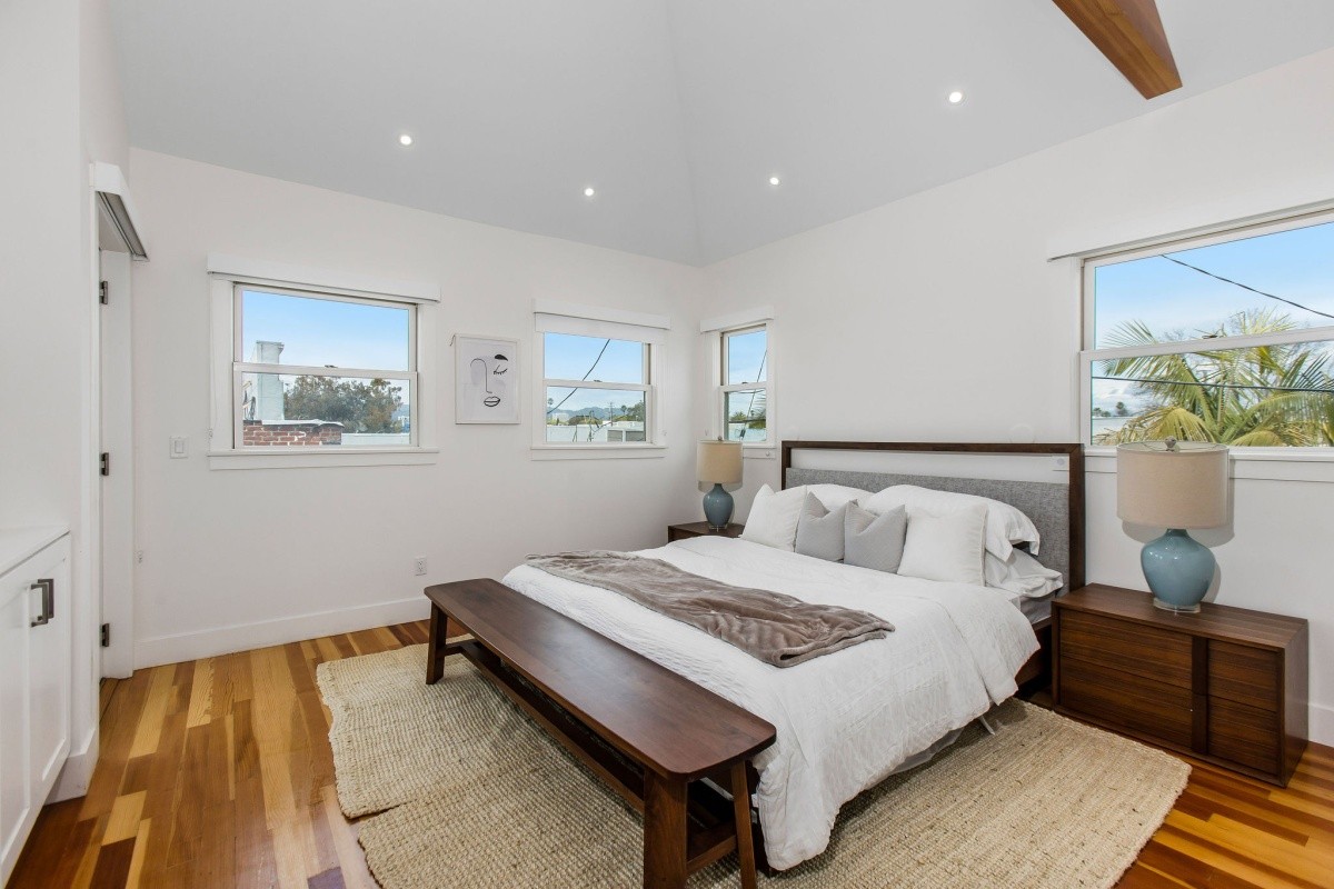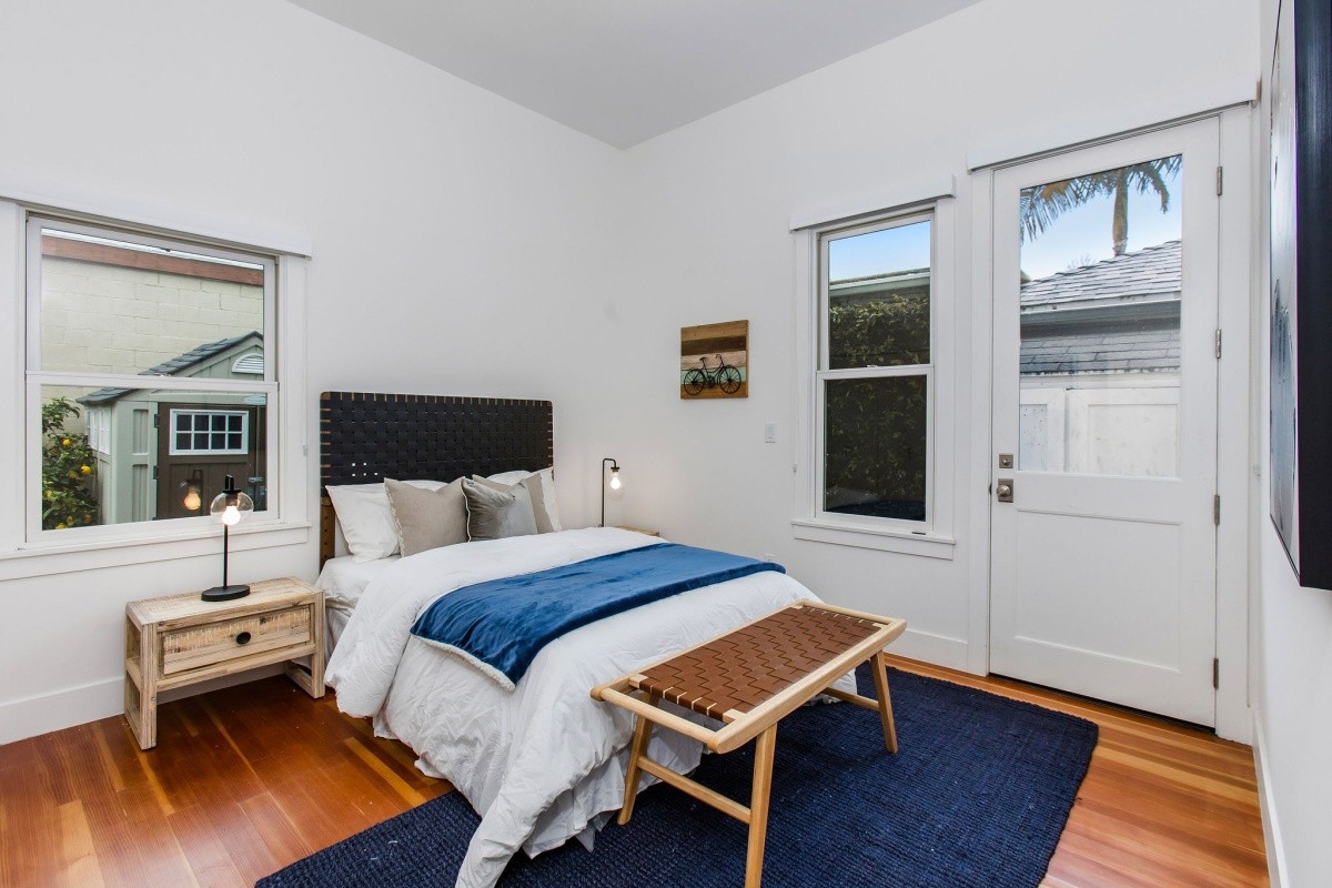 Epitomizing the essence of SoCal beach living, this cheerful and charming retreat resides several blocks from the beach and Main Street, and has been meticulously and lovingly renovated for effortless, enjoyable modern living. Up the front walkway through the hedged and gated front yard, a picture-perfect porch welcomes residents and visitors inside the home. The thoughtfully expanded residence features beautifully designed interior spaces with timeless character accents and useful nuances throughout, beginning in the light and bright living room that features a bay window with bench seating surrounded by floor to ceiling built-in shelving. The living room opens seamlessly into the dining room that's perfect for formal or everyday casual living, while the gourmet chef's kitchen features an open pass-through to the dining room, a second bay window and sunny sitting area, stainless steel appliances, and a stunning tile backsplash. One bedroom and a spacious den/ office reside downstairs, the latter of which can also serve as an optional fourth bedroom and opens out to the back deck. Two comfortable and inviting bedroom suites reside upstairs, both with en-suite baths, and the primary featuring soaring cathedral ceilings and a large walk-in closet. Other amenities include an owned solar system, newer central heating and air, tankless water heater, and two dedicated lines for EV charging. Perfect for indoor/ outdoor living, the property features numerous balconies and other outdoor spaces including a rear yard and deck with a sprawling seating area and projection wall setup for creating memorable evenings. Truly a rare opportunity to own a remarkable property in a prime beach location!