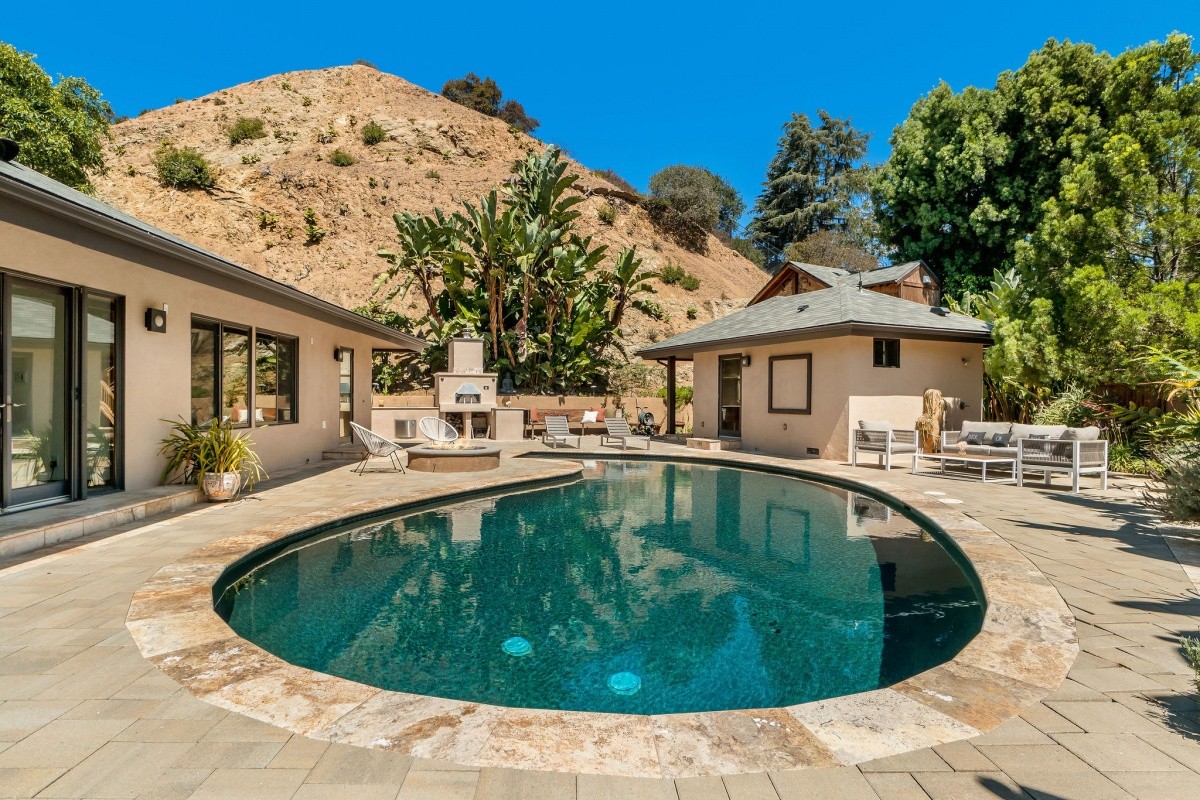 Situated up a long, gated private drive on a 30,000+ sf lot, this one-of-a-kind property in coveted Laurel Hills is an oasis unto itself. Through the lushly landscaped courtyard entrance, the sprawling interior space features stone and wood accents throughout, embracing an organic, earthy zen ambiance. The broad entryway flows effortlessly into the entertaining rooms -- the gourmet chefs kitchen with skylight and center island, showplace formal dining room with walls of windows and stunning built-ins, grand living room with floor to ceiling stone-adorned fireplace, fabulous den/ TV room, intimate reading nook, and informal coffee and bites corner. The primary bedroom suite boasts a skylight that enhances the airy and open feel, and all of the spacious bedroom sanctuaries feature windows bringing the outdoors in, and spa-like en suite baths. Outdoor entertaining and relaxation options abound in the front courtyard and huge rear/ side patio featuring a dark-bottom pool, gas fire pit, and built-in BBQ and pizza oven. A separate accessory living space resides off the pool patio, complete with bedroom, kitchenette, and bath; and a third detached structure boasts a rustic wood adorned office space with soaring wood beam ceilings, bathroom, and storage/ wine cellar space below. A truly remarkable property, located in prime Wonderland School area. Co-listed with Kirk Frieden, Coldwell Banker (DRE #00581910).