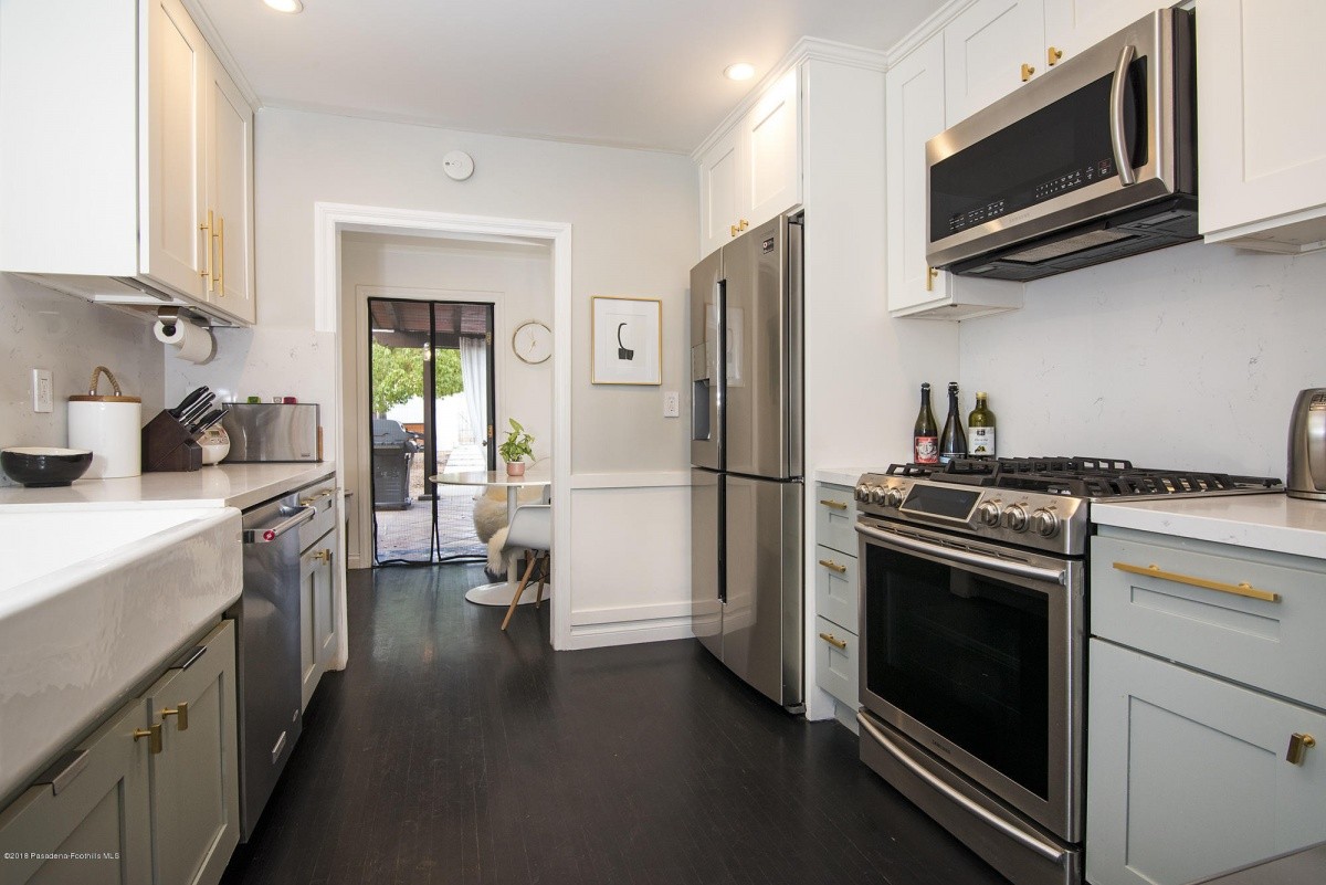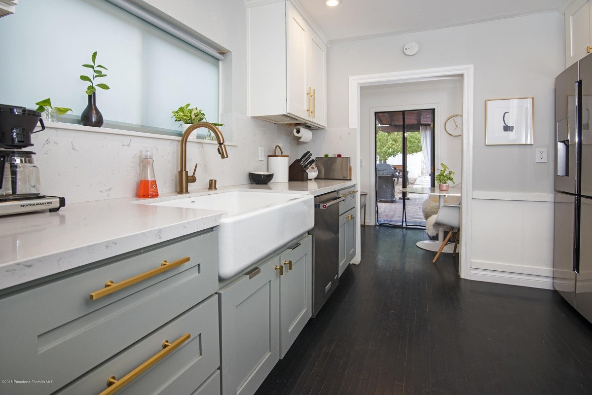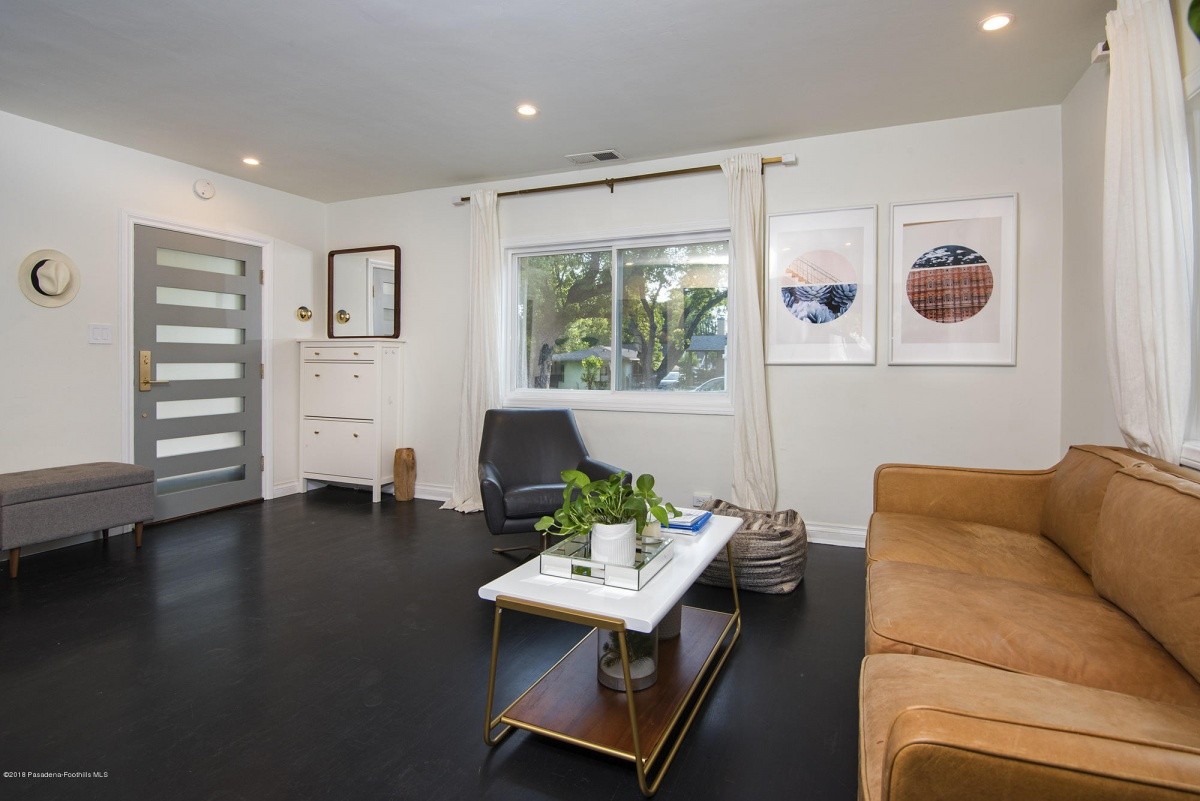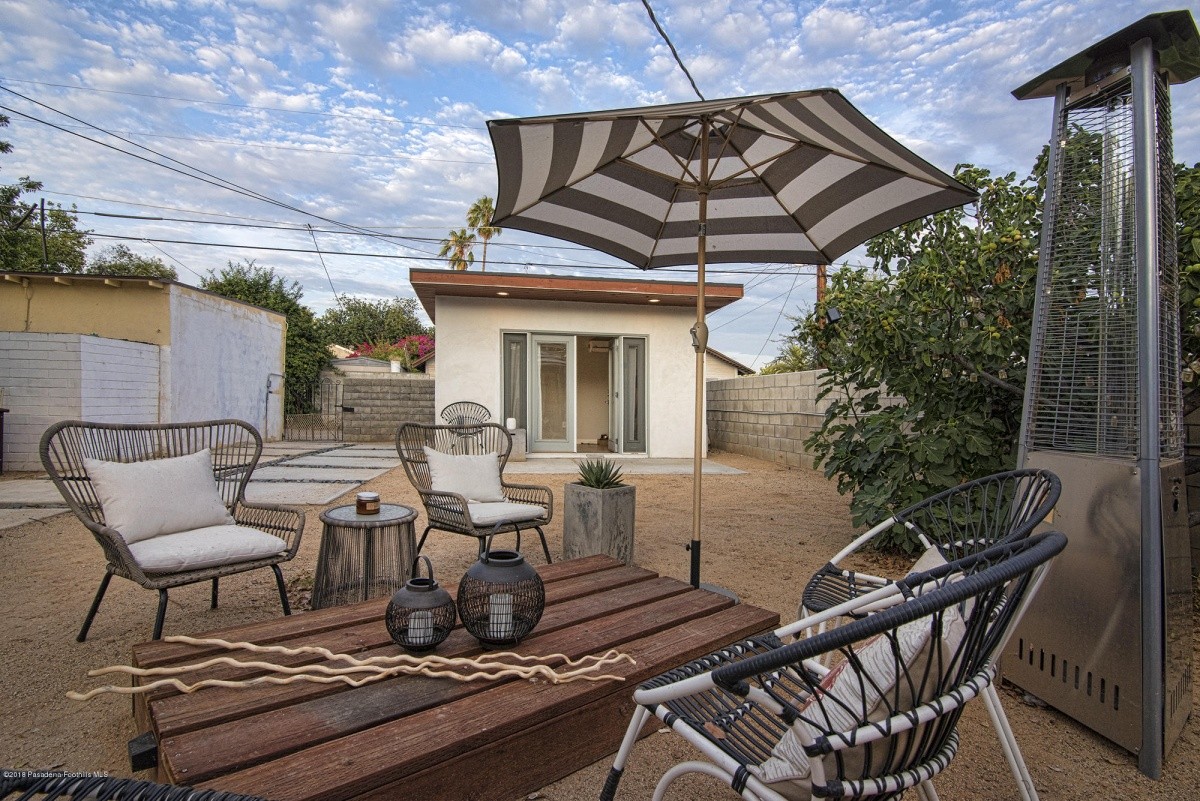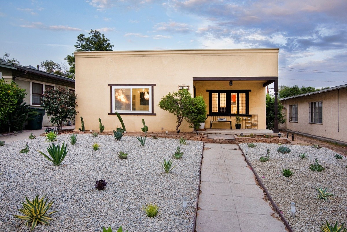 Nestled mid-block on a quiet, tree-lined street, this charming 1921 classic has undergone a sleek modern makeover! Dark hardwood floors, white walls, recessed lighting, and an electric fireplace create a crisp, clean vibe in the entertaining rooms. Natural light permeates the bedroom spaces, which overlook the front and the rear yards. At the end of the hallway lined with built in shelving resides a tastefully updated bathroom. The recently remodeled kitchen boasts stylish easy-access cabinetry, a streamlined new countertop and backsplash, farmhouse sink, and high quality stainless-steel appliances. Beyond the kitchen is a delightful breakfast nook, which leads out to the sprawling covered patio – perfect for outdoor entertaining and relaxing. The private back yard offers plenty of space for garden beds and other landscape features, and includes a permitted storage structure. A 1-car detached garage with extra storage space completes the property.