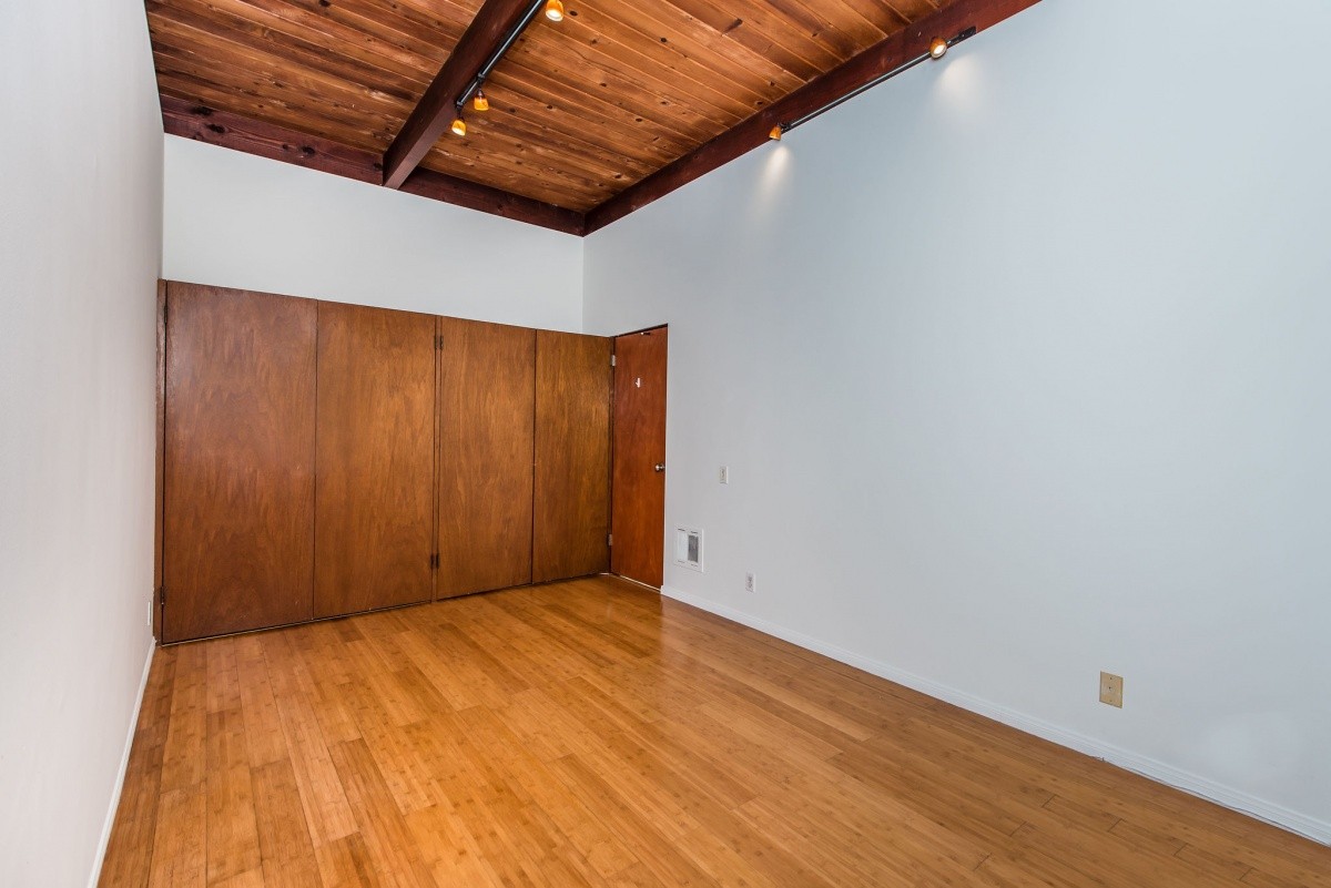 Tranquil escape in the heart of Brentwood! Rustic mid-century architectural condo nestled in a small complex on a quiet cul-de-sac. High wood-beam ceilings and towering walls of bottle-bottom glass add volume and a woodsy retro vibe to the living room and open kitchen, which features stainless steel appliances. Two bedrooms, an updated bath, and decks off the living room and bedrooms complete the property. Moments away from prime Brentwood shopping and dining on San Vicente Boulevard. Parking for 1 vehicle. Available for immediate occupancy.