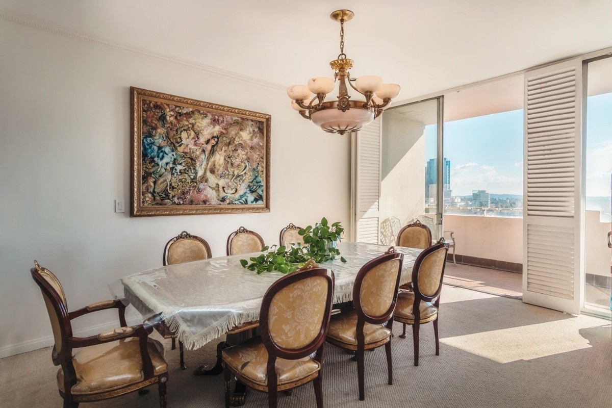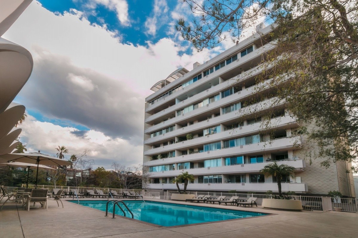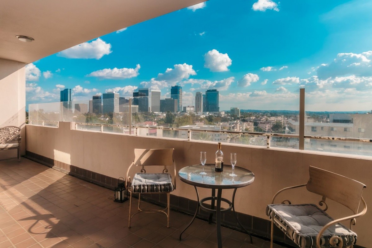 Prime fixer candidate, with sweeping South-facing views from the Century City skyline all the way out to the Pacific Ocean and Catalina! Located in a prestigious, full-service building between the Wilshire Corridor and newly reimagined Westfield Century City mall, the oversized 1-bedroom, 2-bath unit boasts a formal entry and soaring ceilings in the master bedroom and entertaining rooms. Floor to ceiling windows and sliding doors showcase the views and provide an abundance of natural light throughout the living space. A massive balcony opens out from the living room, dining area, and master bedroom to provide endless indoor/ outdoor entertaining and relaxation options. Other features include a separate service entrance into the unit, gas fireplace, and numerous built-ins. The Glen Towers building epitomizes a full service lifestyle, offering residents a 24-hour doorman and front desk staff, valet parking, pool, gym, and numerous utilities and services that are included in the monthly HOA dues.