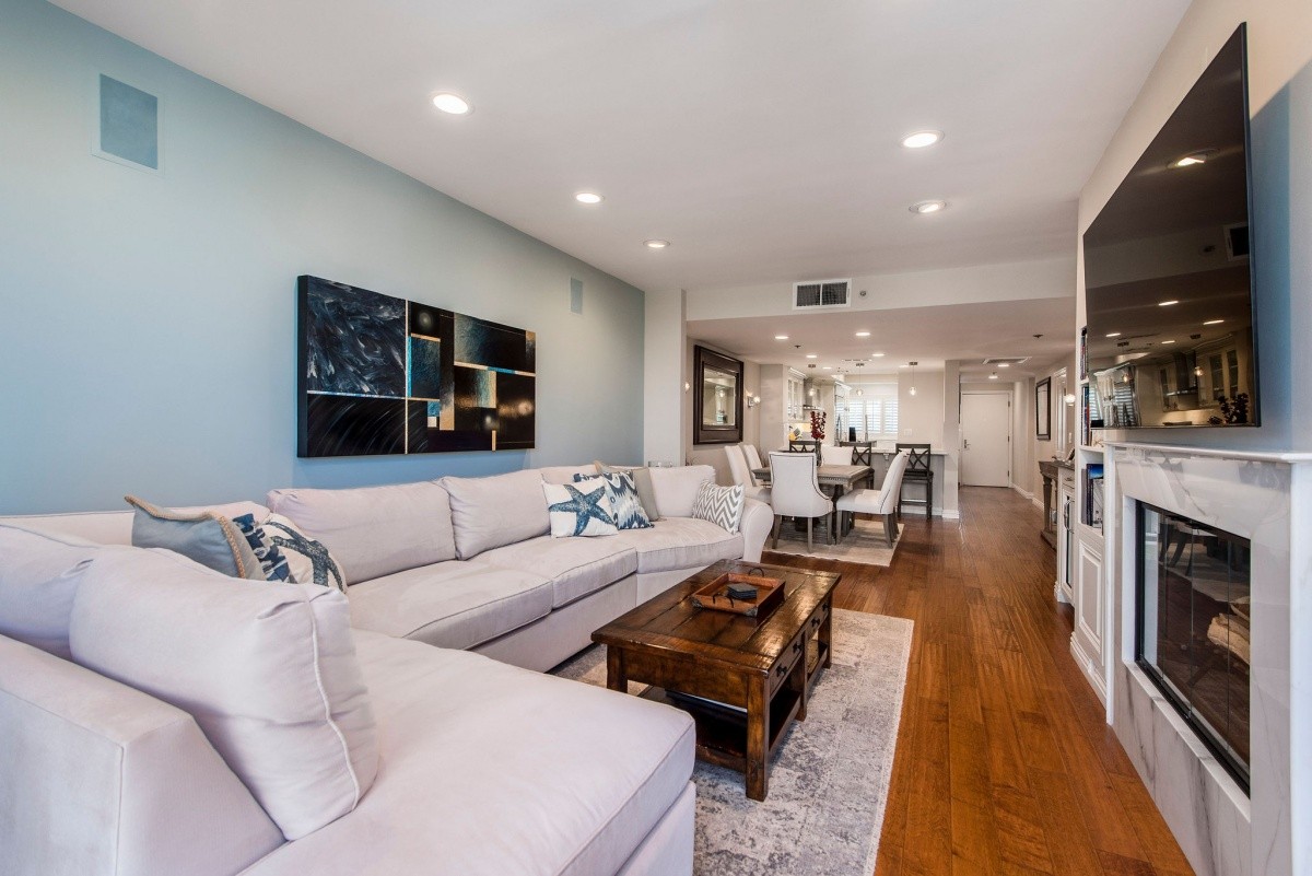 Beachfront living at its finest in this stunningly updated 4th floor residence with views of the pool, palms, and ocean beyond. Beautifully designed for upscale entertaining and everyday living, the spacious living room features built-in shelves and cabinets, a marble adorned fireplace, built-in speakers, a fabulous bar area with bottle storage, and access out to the private balcony for al fresco dining and enjoying picture perfect sunsets. The open dining area flows effortlessly into the gourmet kitchen, which boasts casual bar dining, marble countertops, stainless steel appliances, a wine cooler, and a functional work space. The sumptuous master bedroom includes a walk-in closet, and a spa-like bath with dual sinks and separate tub/ shower. A second bedroom, guest bath, and in-unit laundry complete the living space. Also included are two SxS parking spaces, plus an additional storage locker. Prestigious Sea Colony II is a 24-hour guard gated community offering world class resort amenities: heated pool, 3 spas, gym, rec room, onsite manager, and a private walk to the sand. All located seconds away from Main St. shops and restaurants, Abbott Kinney, tennis and basketball courts, luxury malls, the Metro, and more!