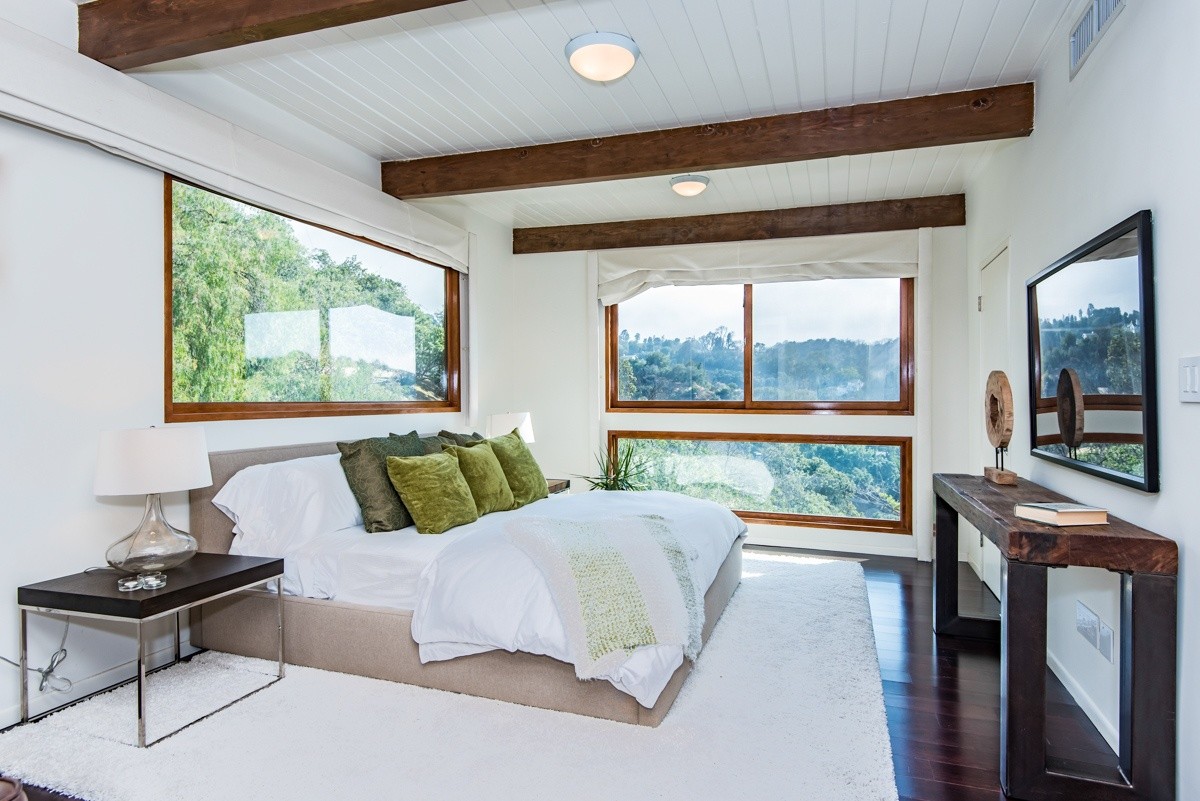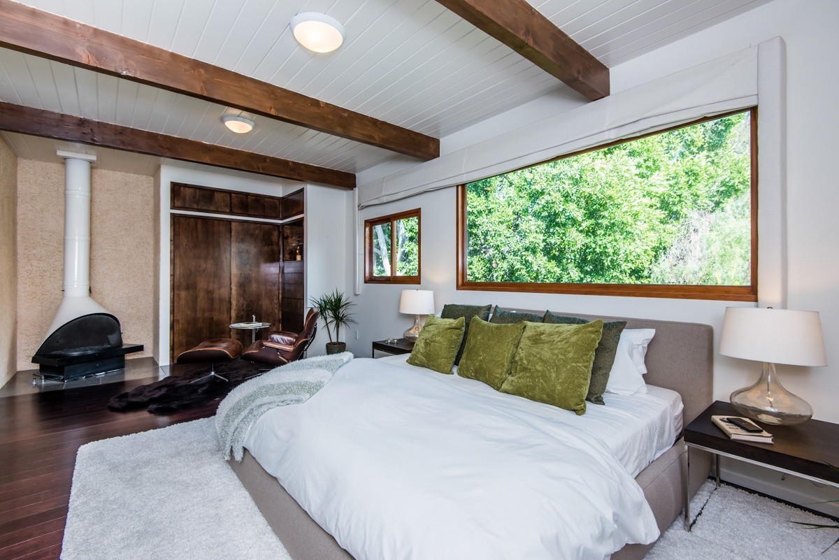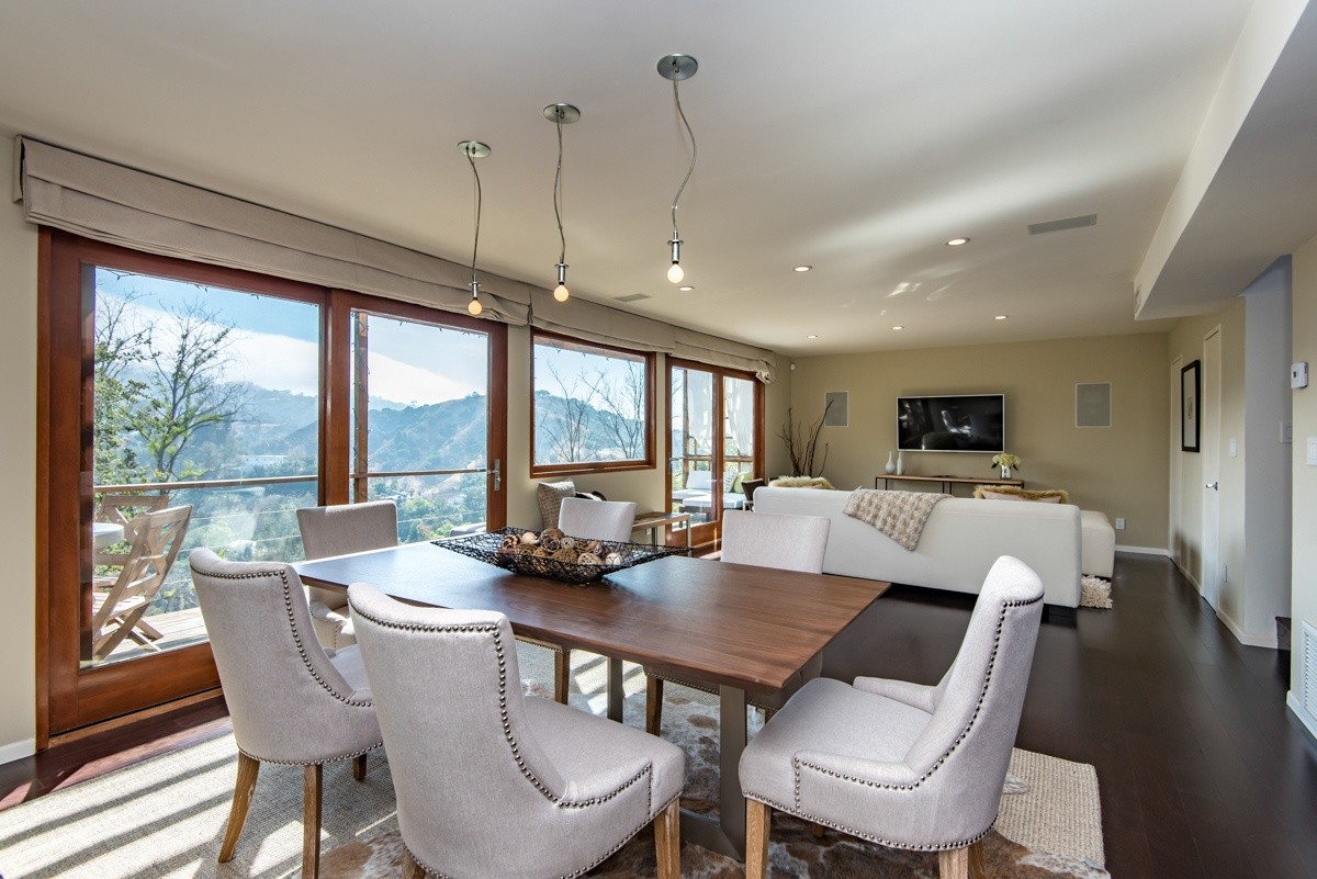 The pinnacle of modern hills living, this sublime escape seamlessly blends 1960's post and beam architectural elements with modern upgrades such as video security, integrated surround sound speakers, and remote-operated shades. Stunning wood-framed windows and sliding doors offer abundant natural light and showcase sweeping views of the canyon and surrounding hills views from nearly every room. The open-concept entertaining level boasts a fabulous gourmet kitchen with Viking Pro appliances, and living and dining areas that open out to a sprawling deck for outdoor enjoyment. Two oversized bedrooms reside upstairs; the master suite includes numerous built-ins, a free-standing fireplace, and a sumptuous bath with skylight. Walled and gated for utmost privacy and security. Fabulous Studio City hills location – moments away from Ventura Boulevard, and easy access to freeways or the Westside.